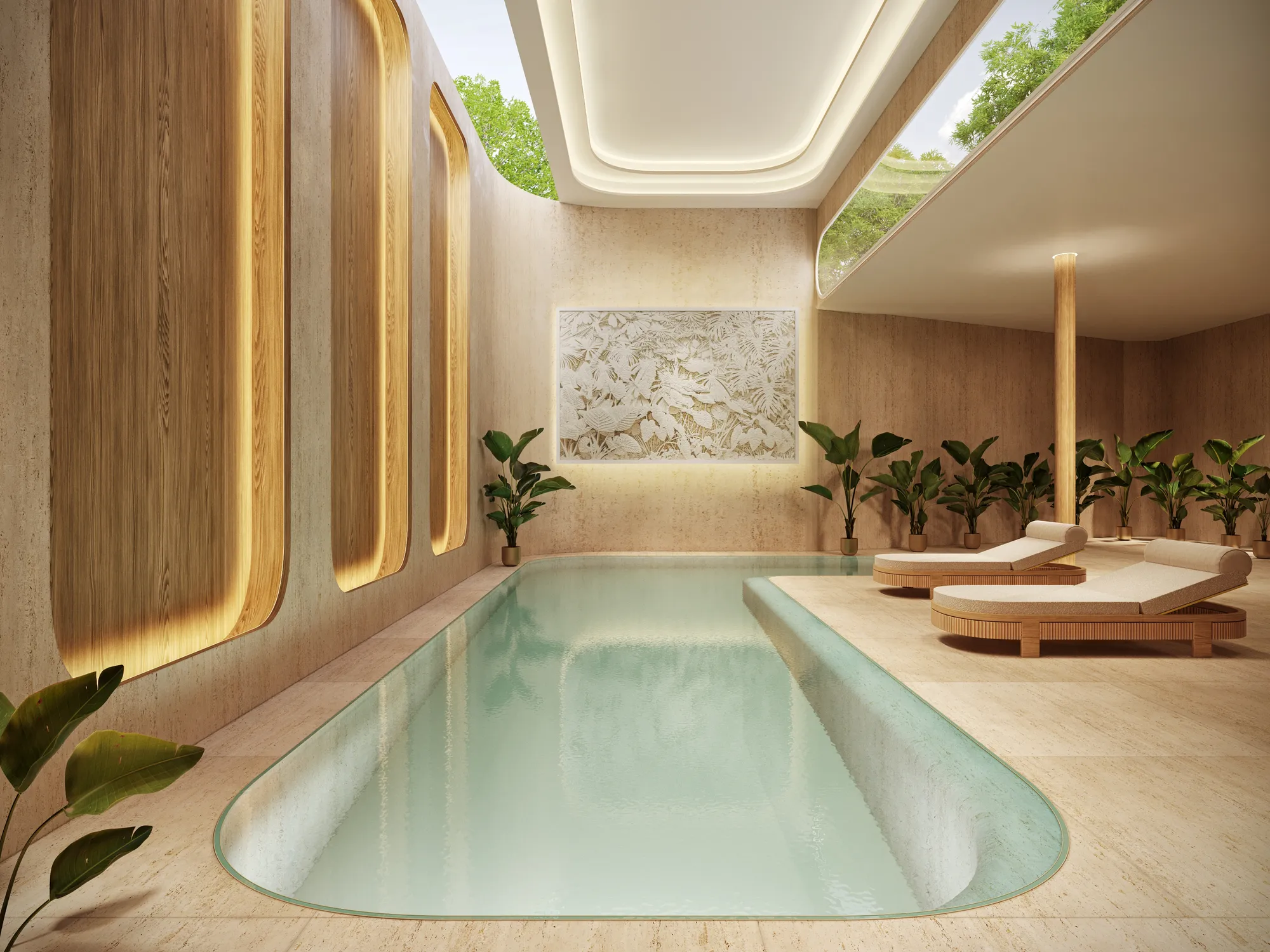 Dos piscinas, una exterior rodeada de vegetación y otra interior bañada por luz natural, convierten el agua en el elemento central del bienestar.